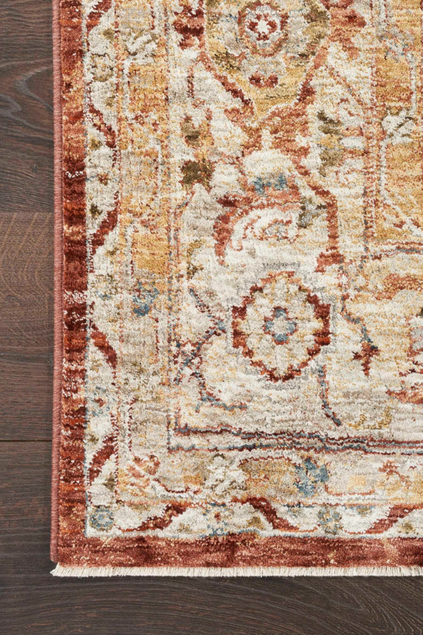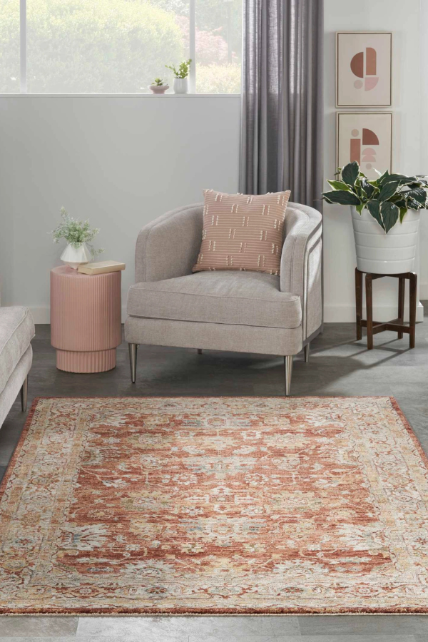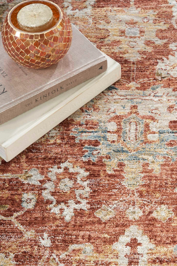 Bring traditional style to your space with this Persian rug from the Sahar Collection. It features a detailed medallion pattern on a rich rust ground, framed by a classic border and distressed finish that adds vintage flair. Machine-made from durable, easy-clean polyester fibers that will easily enhance your living room, dining room, bedroom, kitchen, or hallway.