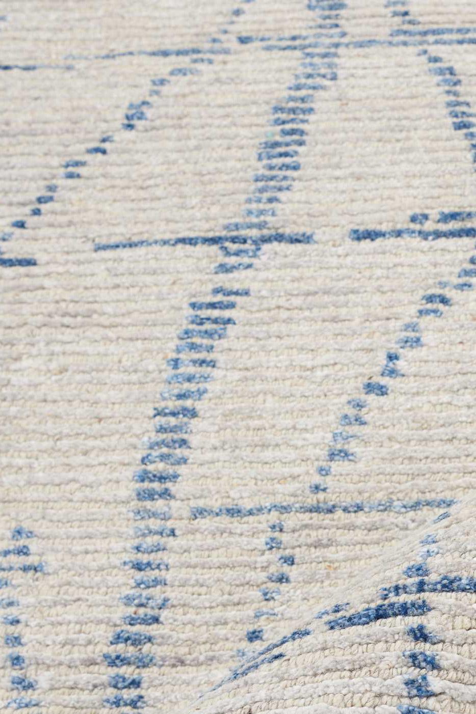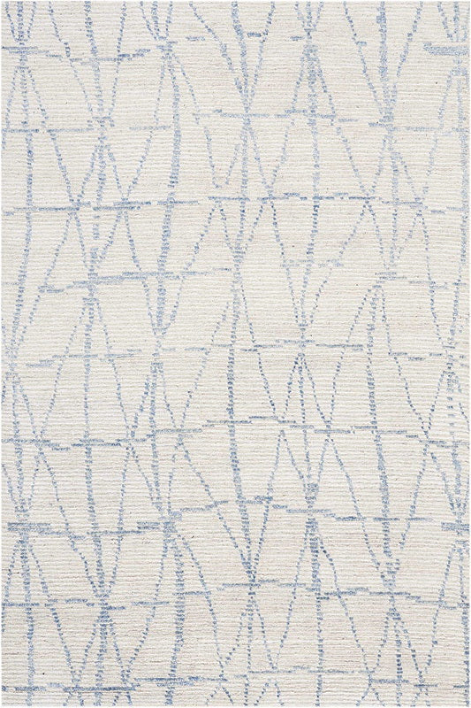 A palette of pale azure on ivory gives this oversized area rug its elusive and luminous beauty. An abstract pattern of intersecting lines creates an etched effect of elongated diamonds, with texture enhanced by magnificent hand-knotting. Superb quality is evident in this versatile area rug designed for the sophisticated room.
