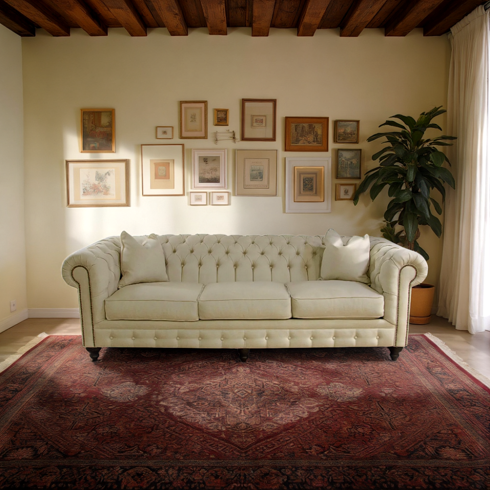 The Rondell collection is an interpretation of the iconic English Chesterfield. This classic style features a beautifully tufted back and inside arm, simple front rail with button accents, a large rolled shelter arm accented with optional petite antique bronze nail heads, and an intricate turned wooden leg. Available in sofa, love, chair and ottoman covered in your choice of fabric or leather.