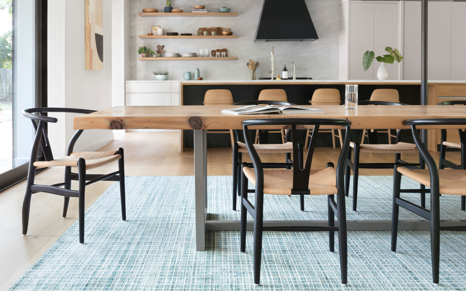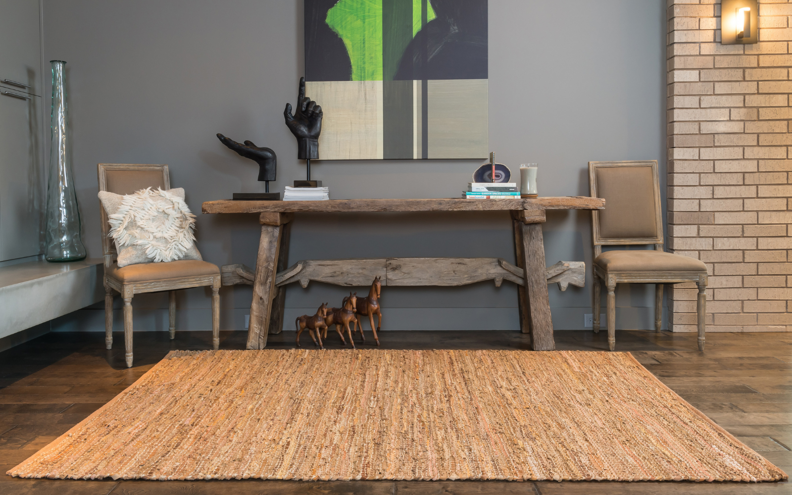As people are downsizing, 5x8 and 6x9 rugs are becoming extremely popular. In many instances, they work interchangeable and give the designer a ton of unique options. In a standard setup, the furniture starts to separate itself from the rug, especially in 5x8. 6x9 and 5x8 rugs are rarely used in a standard dining setup but apartment living has completely changed the way we interact with our space. Our favorite designs push the table to a window or wall. This saves a ton of space and can maximize light at the dining table.